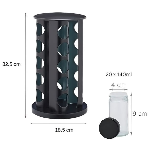 📦 Paket uključuje: 1x Stalak za začine, 20x Staklenih posuda s hermetičkim crnim poklopcem